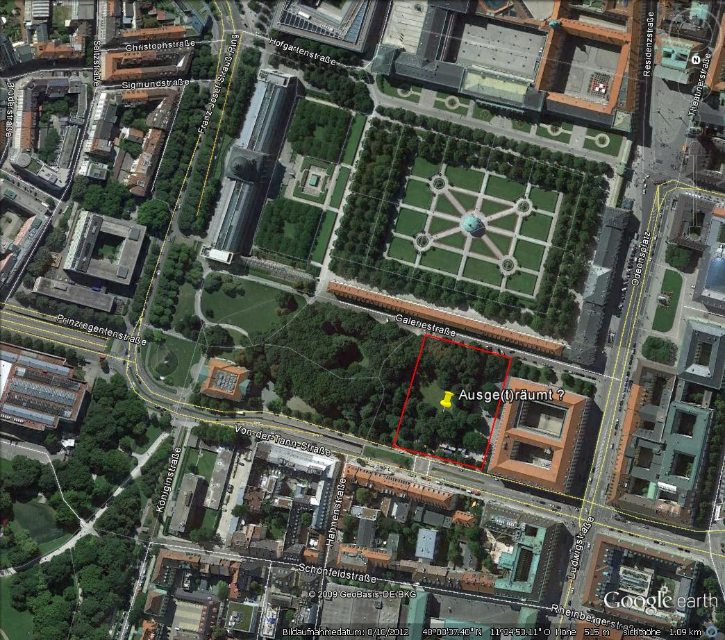 Das kleine Bild hier zeigt die voraussichtlich zu rodende Fläche im FINANZGARTEN, um den gesamten Bauplatz der virtuellen Krempels-Konzertsaal-Planung freizuräumen. Das ist dann allein schon im bildhaften Vergleich mit den Kriegs-Schäden im FINANZGARTEN in einer Art und Weise so offensichtlich kein Konzertsaal-Standort "nur auf dem Parkplatz hinter dem Landwirtschaftsministerium", dass zumindest eine Feststellung hierbei zutrifft: